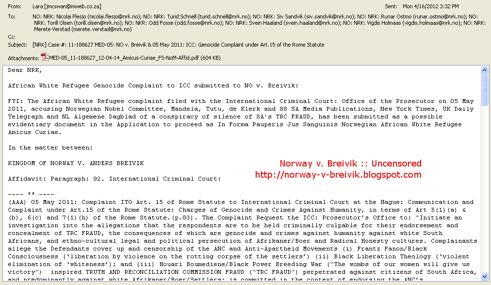 FYI: The African White Refugee complaint filed with the International Criminal Court: Office of the Prosecutor on 05 May 2011, accusing Norwegian Nobel Committee, Mandela, Tutu, de Klerk and 88 SA Media Publications, New York Times, UK Daily Telegraph and NL Algemene Dagblad of a conspiracy of silence of SA's TRC FRAUD, has been submitted as a possible evidentiary document in the Application to proceed as In Forma Pauperis Jus Sanguinis Norwegian African White Refugee Amicus Curiae.